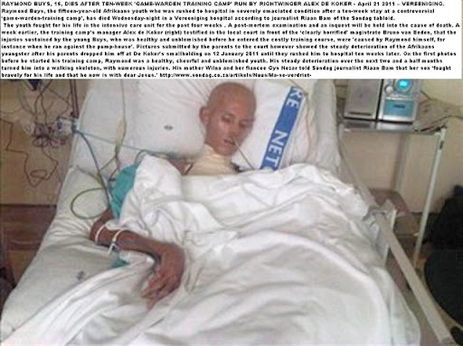 15-year-old Raymond Buys was admitted to a hospital in Vereeniging, South Africa, with numerous physical injuries, including skull fractures. The teen died a month later.
