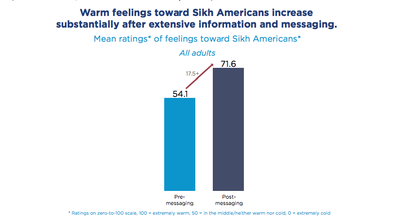 In the focus groups conducted as a part of the larger study, researchers found that once Americans learned about Sikhism that there was a 17.5% increase in positive feeling toward the community: “After reading about Sikh history and beliefs. as well as the series of messages, warm feelings toward Sikh Americans increase substantially,” the survey notes. Ghuman also points out: “Groups that are generally stereotyped as less tolerant on race relations (i.e., Republicans, Hispanics and older Americans) had some of the highest levels of impact.”